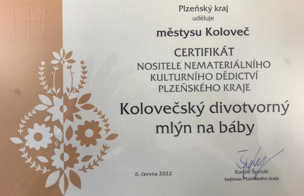Plzeňský kraj se rozhodl ocenit přínos městyse Koloveč a jeho obyvatel tradiční lidové kultuře Plzeňského kraje a Městys Koloveč byl proto na základě doporučení odborné komise a rozhodnutí Rady Plzeňského kraje zapsán do Seznamu nemateriálních statků tradiční lidové kultury Plzeňského kraje, jako nositel nemateriálního kulturního dědictví Plzeňského kraje – lidové tradice „Kolovečského divotvorného mlýna na báby“ .