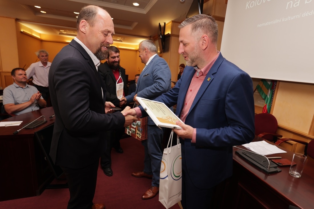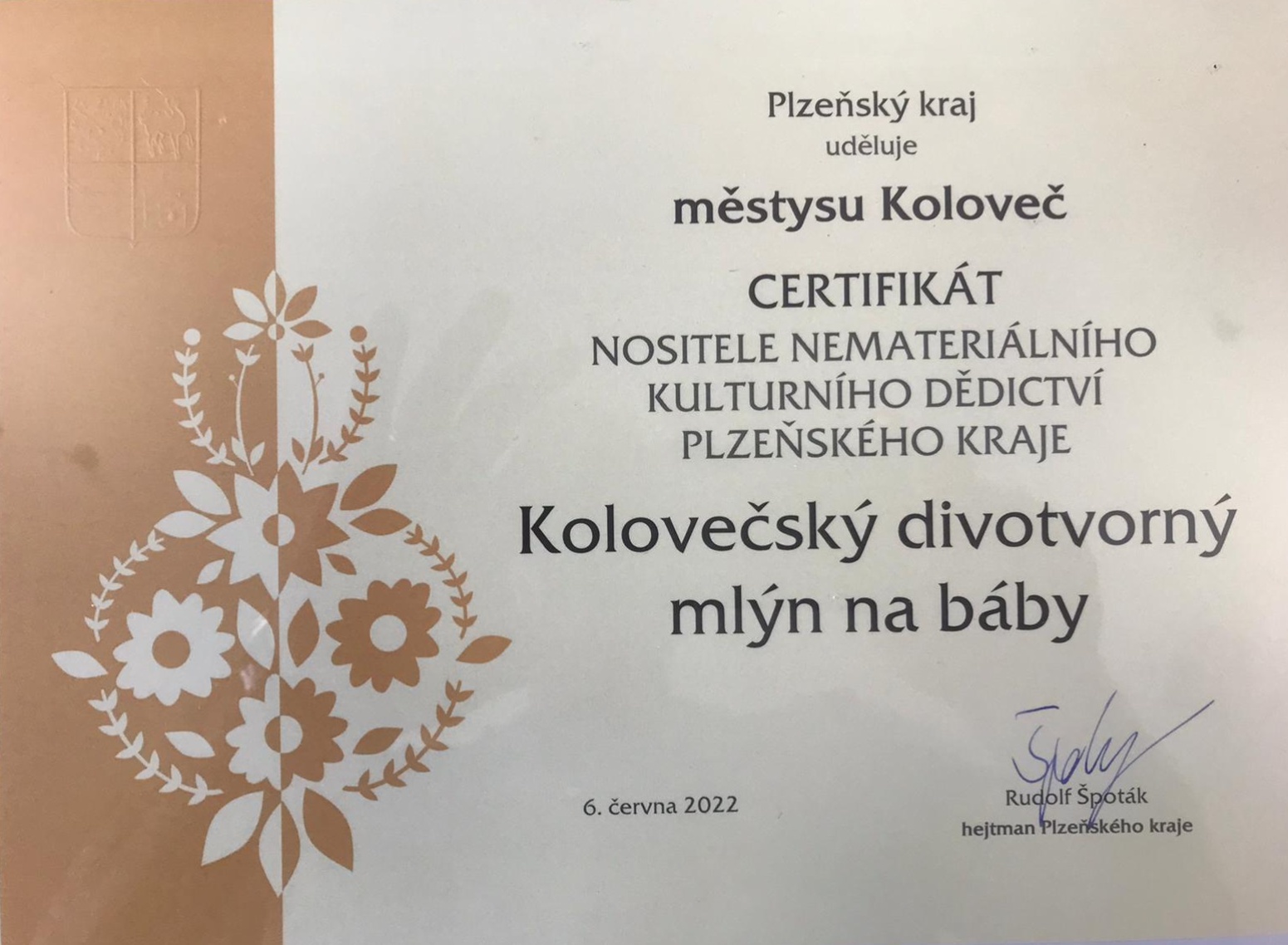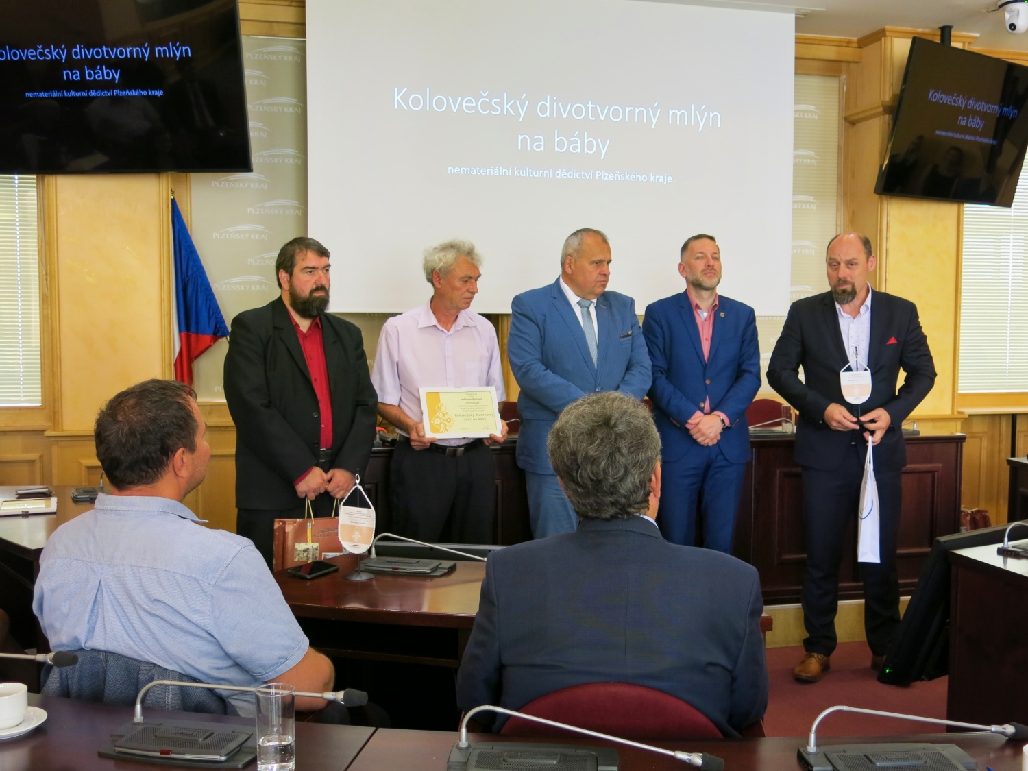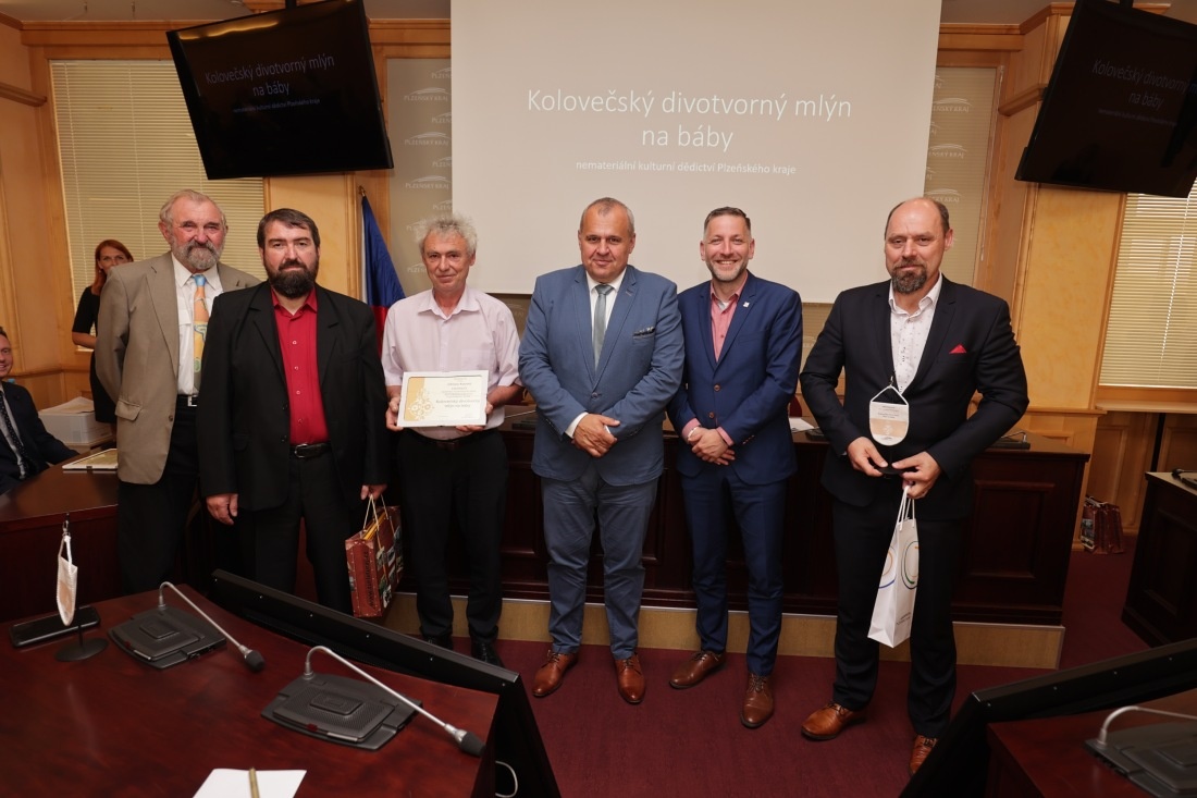 Ke slavnostnímu předání certifikátu se znakem Plzeňského kraje zástupcům městyse Koloveč, jmenovitě Ing. Václavu Perglovi, starostovi městyse Koloveč, Petru Hájkovi, místostarostovi městyse Koloveč, Martinu Volfovi a Karlu Cozlovi, režisérům lidové slavnosti, z rukou Rudolfa Špotáka, hejtmana Plzeňského kraje a Ing. Libora Picky, člena Rady Plzeňského kraje pro kulturu, památkovou péči a cestovní ruch, došlo při osobním setkání všech zainteresovaných v pondělí 6.6.2022 v prostorách Plzeňského kraje.