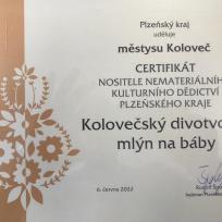 Plzeňský kraj se rozhodl ocenit přínos městyse Koloveč a jeho obyvatel tradiční lidové kultuře Plzeňského kraje a Městys Koloveč byl proto na základě doporučení odborné komise a rozhodnutí Rady Plzeňského kraje zapsán do Seznamu nemateriálních statků tradiční lidové kultury Plzeňského kraje, jako nositel nemateriálního kulturního dědictví Plzeňského kraje – lidové tradice „Kolovečského divotvorného mlýna na báby“ .